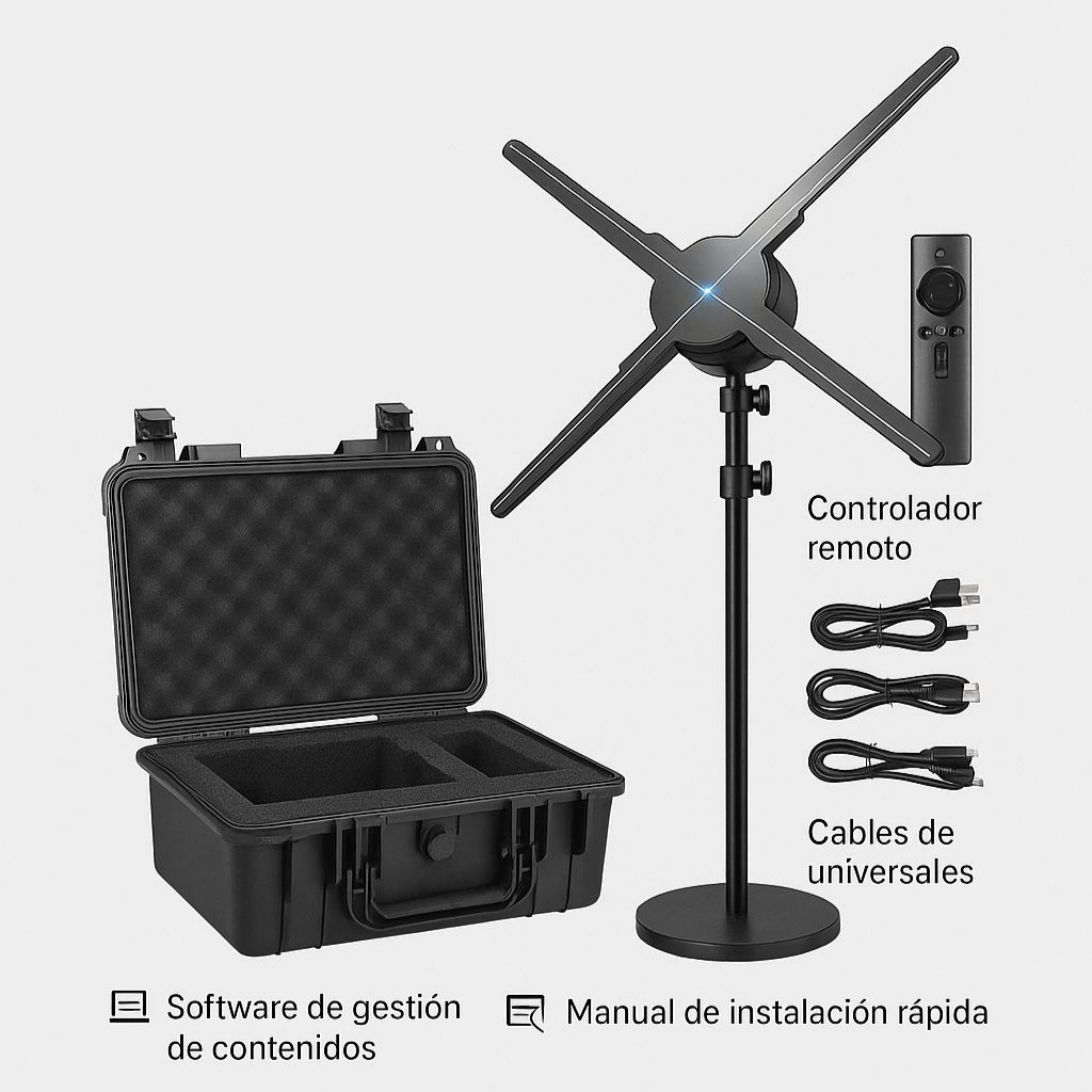 El dispositivo perfecto para impactar en tiendas, vitrinas y eventos. Proyecta contenido en 3D con alta definición, generando un efecto visual flotante y sin pantallas. Ideal para destacar productos, promociones o logos con un estilo futurista.